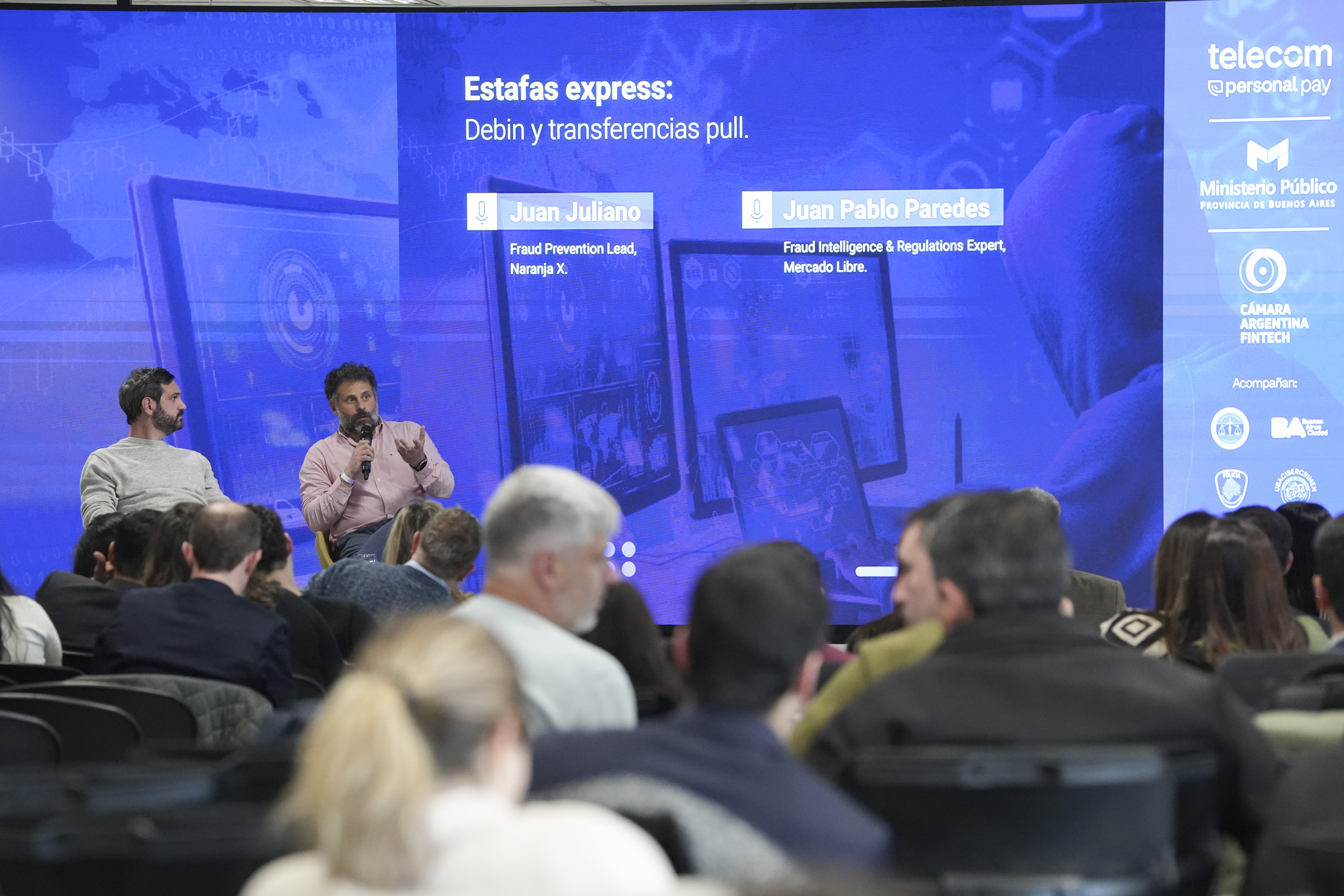 Posteriormente, se desarrolló la disertación sobre “Estafas express: débito y transferencias pull”, en pos de explorar las modalidades de fraude digital que están proliferando en el ecosistema financiero argentino y visibilizar los desafíos técnicos, jurídicos y de política pública que se presentan, repasar prácticas de prevención y denuncias, que estuvo a cargo de Juan Juliano de Fraud Prevention Lead (Naranja X), y de Juan Pablo Paredes, de Fraud Intelligence & Regulations Expert (Mercado Libre).