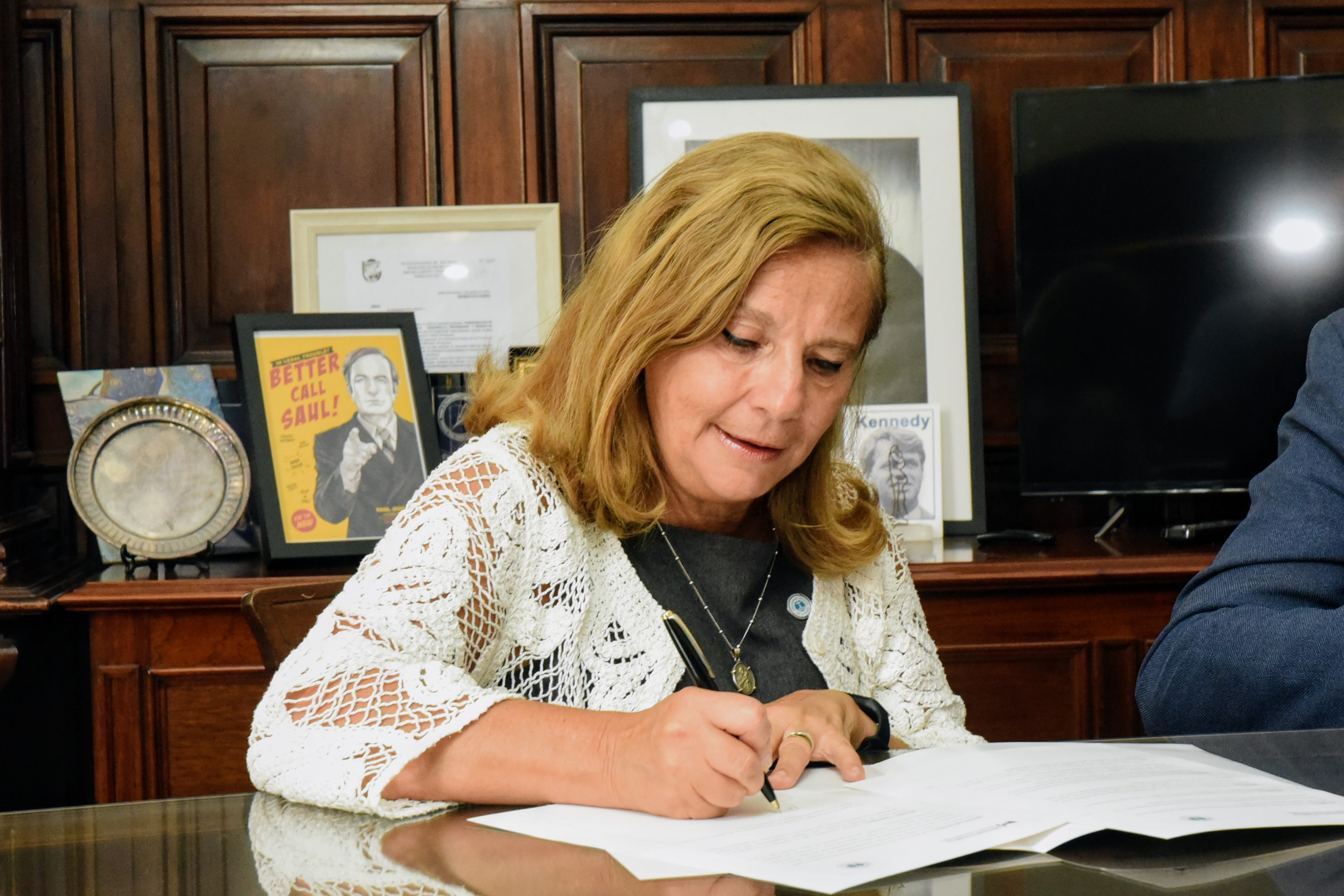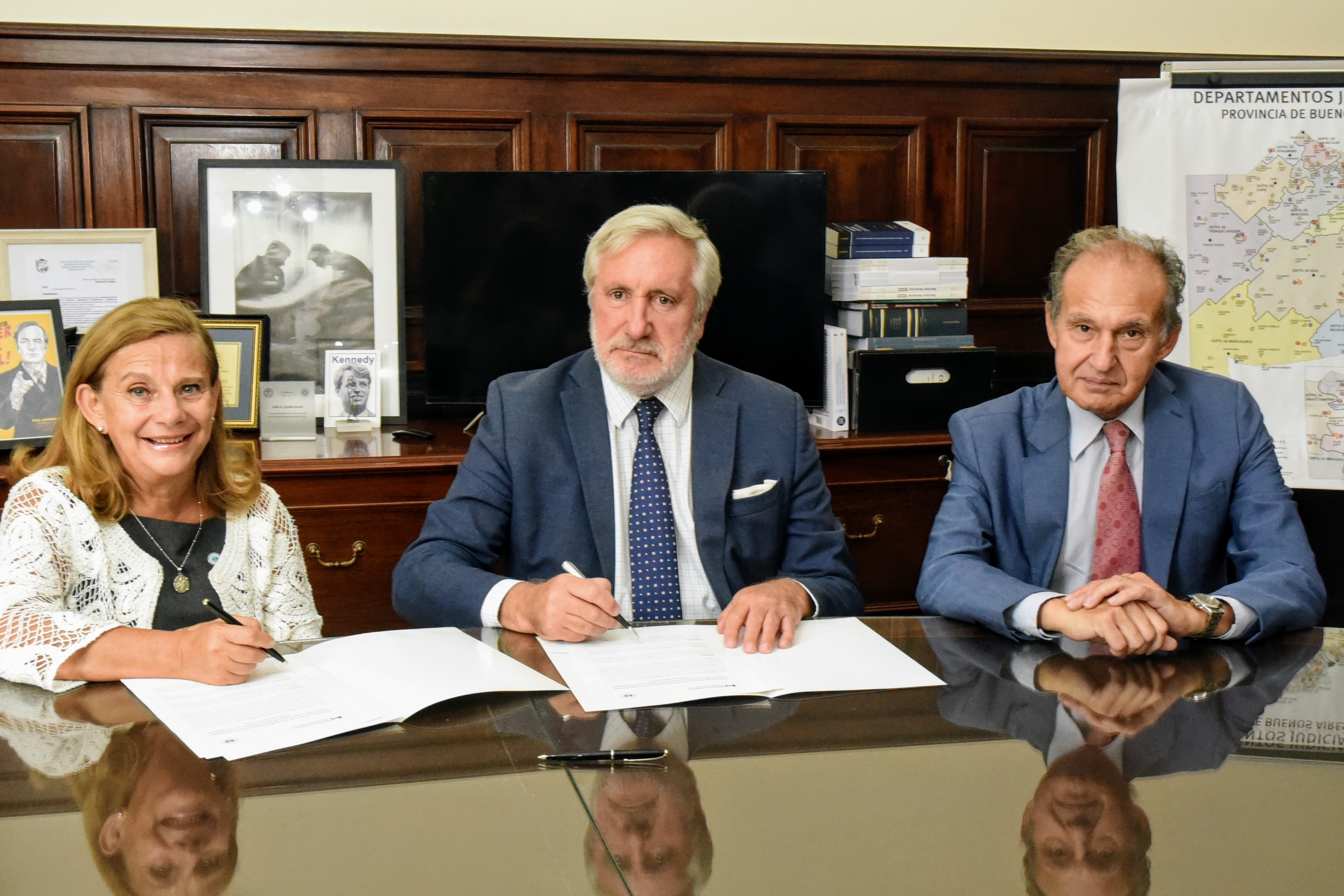 El Procurador General, Dr. Julio Conte-Grand; la Rectora de la Universidad Católica de la ciudad de La Plata (UCALP), Dra. Rita Marcela Gajate; y el Decano de la Facultad de Derecho y Ciencias Políticas, Dr. Miguel Gonzales Andia, firmaron un convenio de prácticas estudiantiles.